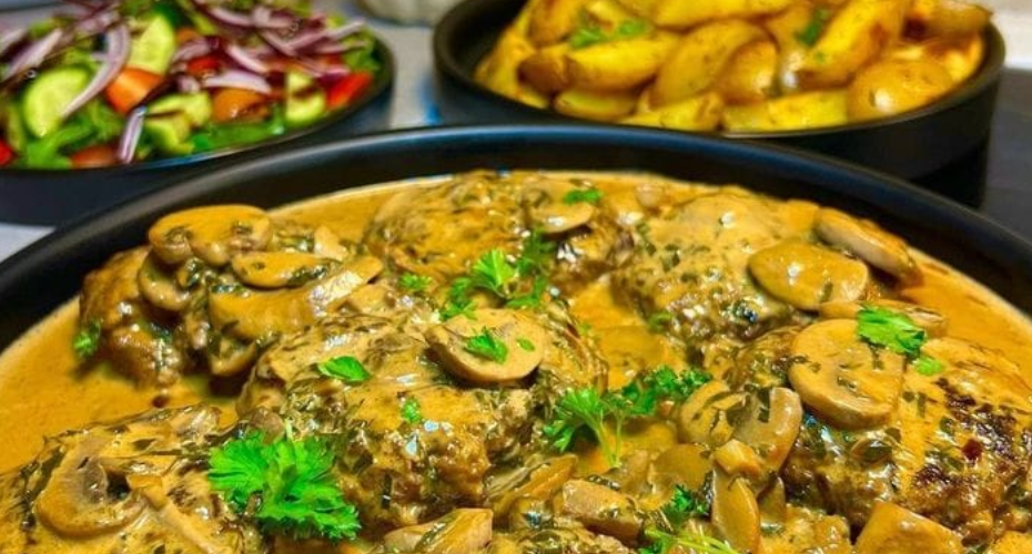 SAPPIGE STEAKS IN CHAMPIGNONSAUS MET KLEVERIGE AARDAPPELEN